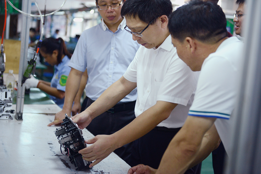 王鎮長一行下車后直奔生產現場。向金祿科技龍董事長非常細心地了解CNC車間、裝配車間、 自動化車間、 實驗室、檢測部門。視察了核心技術設備及管理升級的成果。 王鎮長特別推崇金祿公司倡導“軍隊+ 學校+ 家”的企業文化。